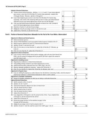 This document is an Arizona tax form for itemizing deductions for part-year residents. It provides line items to calculate itemized deductions for medical expenses, taxes, interest, gifts to charity, casualty losses, job expenses, and other items. It then calculates what portion of the itemized deductions are allowable for the part of the year when the taxpayer was a nonresident.