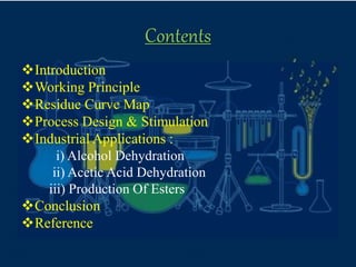 This document provides an overview of azeotropic distillation. It begins with an introduction that defines azeotropic distillation as a process where an entrainer is added to a feed mixture to form an azeotrope that can be separated. The document then discusses the working principle, provides examples of residue curve maps, and outlines considerations for process design and simulation. Finally, it discusses several industrial applications of azeotropic distillation, including alcohol dehydration, acetic acid dehydration, and ester production, before concluding and listing references.