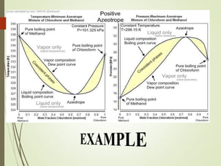 Azeotropic distillation is a distillation technique used to separate mixtures that form a constant-boiling azeotrope. An azeotrope is a mixture of two or more liquids that cannot be separated by simple distillation because the vapor produced has the same composition as the liquid mixture. Entrainers are added to break the azeotrope by changing the volatility of the components. Common applications include removing water from ethanol using cyclohexane as the entrainer. Azeotropic distillation units consist of containers, decanters, and steamers to separate components into different boiling point fractions.