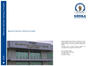 Gonka Inc. is a mechanical contracting company in Azerbaijan specializing in HVAC systems for various Olympic training complexes, schools, hotels, and hospitals. The document details their extensive experience in supplying and installing air handling units, chillers, and laminar flow systems, emphasizing features like energy efficiency and effective air filtration. Notable projects include the completed HVAC installations at multiple Olympic training facilities and various healthcare institutions between 2006 and 2009.