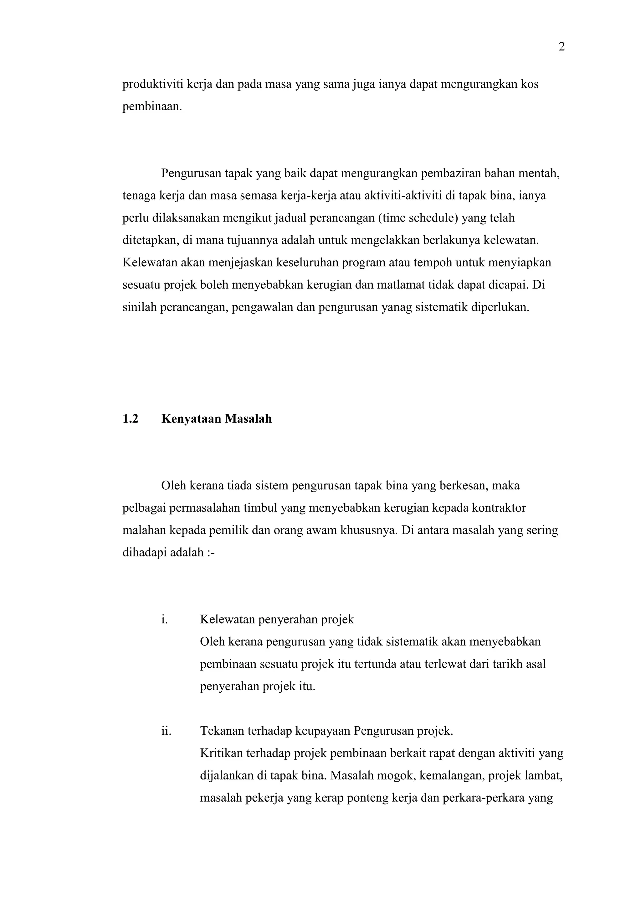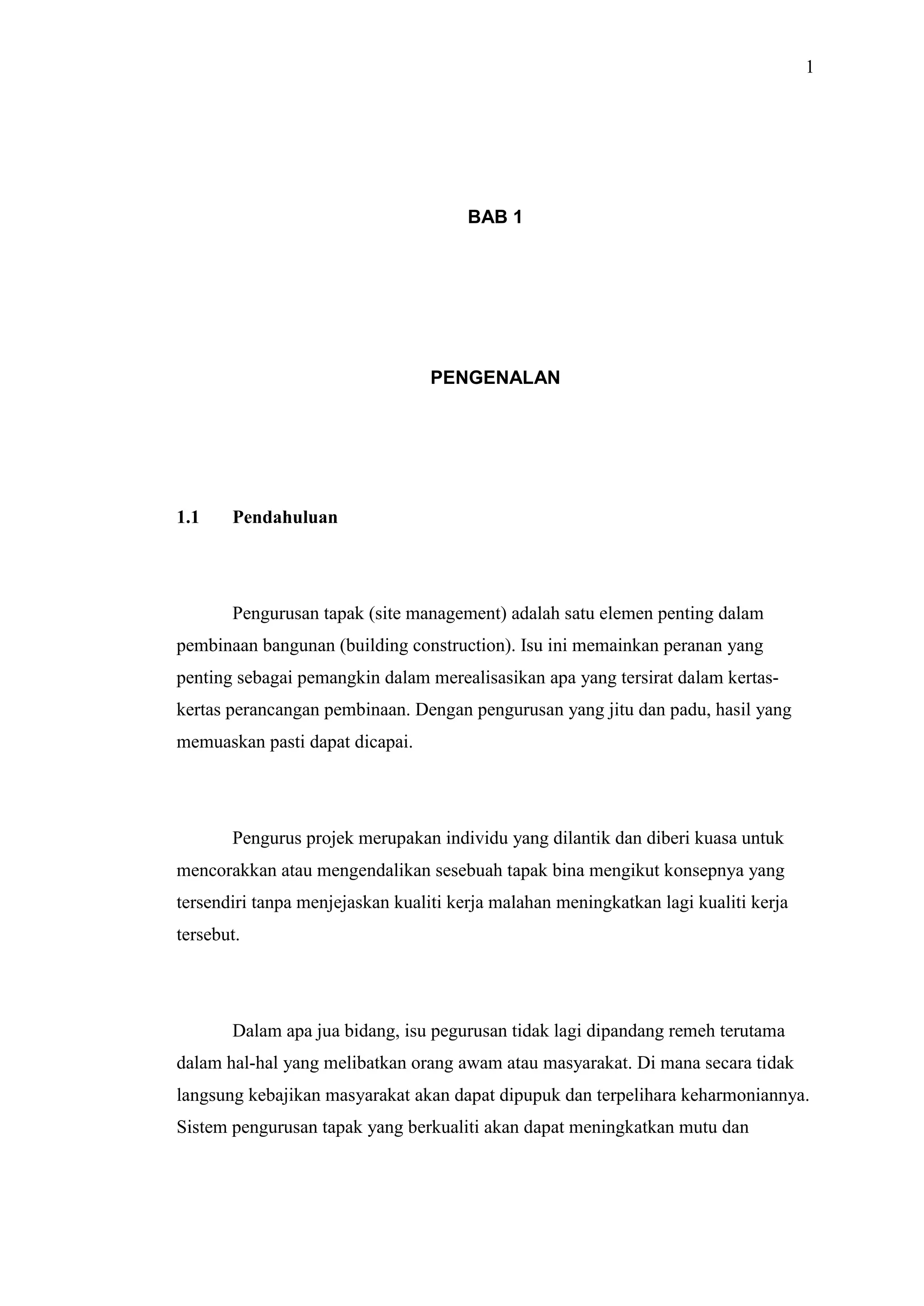 Pengurusan tapak adalah elemen penting dalam pembinaan yang mempengaruhi kejayaan projek dan kualiti kerja. Kelemahan dalam sistem pengurusan tapak boleh menyebabkan kelewatan, kos tambahan, dan isu-isu lain yang memberi impak negatif kepada projek. Kajian ini bertujuan untuk mengenal pasti elemen dan kaedah penting dalam pengurusan tapak untuk meningkatkan kecekapan dan mengatasi masalah kelewatan dalam pembinaan.