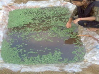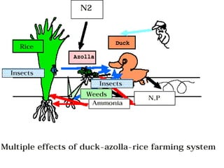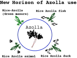 Azolla is an aquatic fern that fixes atmospheric nitrogen through a symbiotic relationship with cyanobacteria. It can be cultivated for use as a green manure in rice production systems. When applied to rice fields, azolla increases soil nitrogen levels and can reduce the need for nitrogen fertilizer by 30-40%, while increasing rice yields by 20-30%. Azolla contains 5% nitrogen and other nutrients and grows rapidly, multiplying to form a thick mat. It is usually applied to rice fields as a green manure before transplanting rice or grown together with rice in a dual cropping system to supply nitrogen over the growth period.