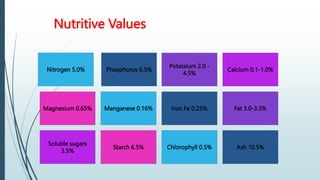 This document summarizes the nutritive values and benefits of Azolla, a fast-growing aquatic fern. It notes that Azolla is rich in protein, amino acids, minerals and vitamins. It fixes nitrogen from the air, controls weeds and mosquitoes, and can remove carbon from the environment. The document also outlines the production requirements for growing Azolla, including fresh water, temperatures of 25-35 degrees Celsius, shade, and integrated fish and Azolla farming for increased yields and reduced costs.