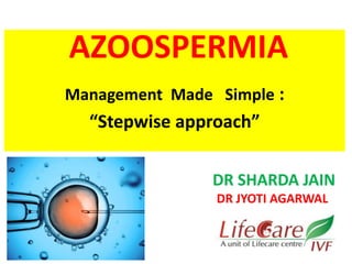 This document provides a summary of azoospermia (the absence of sperm in semen) including its causes, evaluation, and management. It discusses the three main types of azoospermia - pre-testicular, testicular failure, and obstructive. For evaluation, it recommends a three step process of history, physical exam, and basic investigations like FSH and testosterone levels. For management of obstructive azoospermia, it recommends attempting PESA first before moving to TESE/TESA extraction if needed. For testicular failure, it discusses treatments like TESE, microTESE to potentially find sperm, with a minimum 6 month gap between attempts. The document emphasizes a collaborative approach