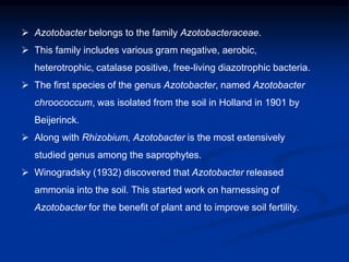 This document discusses Azotobacter, a genus of nitrogen-fixing bacteria that can be used as a biofertilizer. It describes the key species of Azotobacter, their identifying characteristics, and their benefits to agriculture. Azotobacter promotes plant growth by fixing atmospheric nitrogen and producing plant hormones. It also functions as a biocontrol agent by suppressing plant pathogens. The document outlines Azotobacter's mode of action in plants and provides examples of increased crop yields and quality from its use as an inoculant. It also discusses the maintenance, selection, and mass production methods for Azotobacter cultures.
