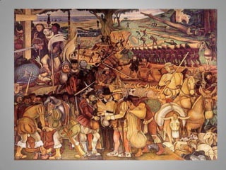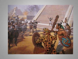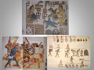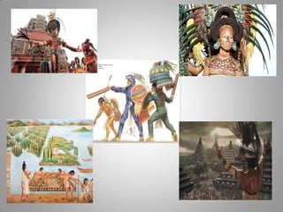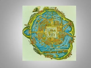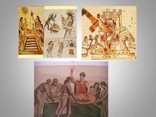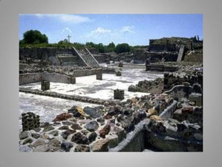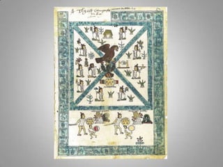 The Aztecs were guided to settle on an island in a lake after seeing an eagle perched on a cactus, fulfilling a prophecy. They built their city of Tenochtitlan there, which now lies at the center of Mexico City. The Aztecs had several creation myths to explain the origins of the world and humanity. After the Spanish conquest, Cortes initially maintained Aztec rule but replaced the nobility with Spanish landowners, establishing an oppressive system of forced native labor on silver mines that contributed greatly to Spain's wealth for hundreds of years. The Aztec education system was abolished and aspects of their culture were forbidden, contributing to the civilization's decline under Spanish rule.
