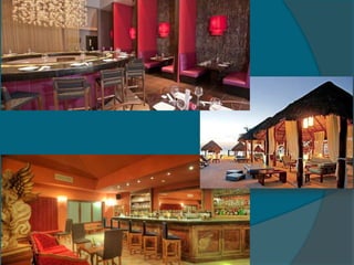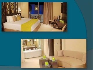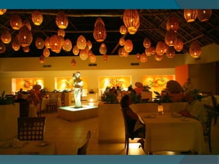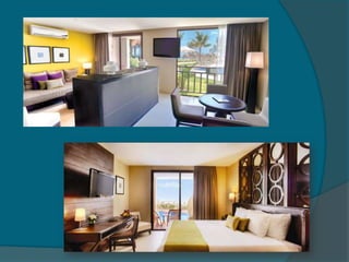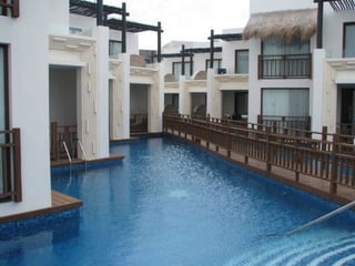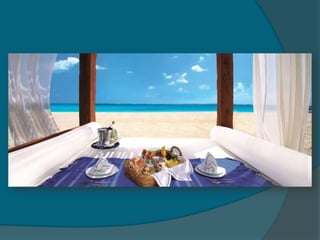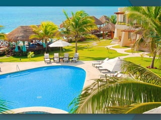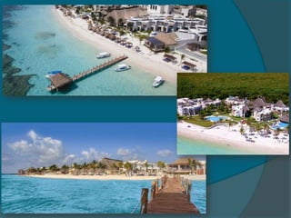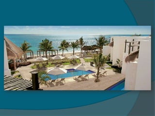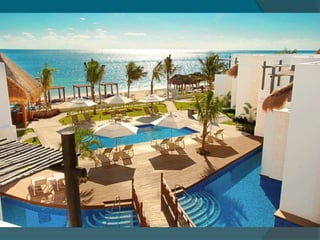 The document describes the Azul Beach resort located near Cancun, Mexico. It is a boutique resort with only 97 rooms overlooking the turquoise waters of the Mexican Caribbean. The resort offers luxurious accommodations, gourmet dining options, a kids club, spa, and numerous beach and pool activities for families and couples.