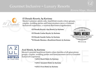 The document describes the Azul Sensatori Hotel by Karisma, which features 438 luxurious suites, 6 a la carte restaurants, 8 bars and lounges, a spa, tennis courts, kids and teens clubs, and amenities included in the Gourmet Inclusive experience such as nightly shows and non-motorized water sports. The hotel sits on over 1,000 feet of beach and offers suites with jacuzzis, room service, and premium brands.