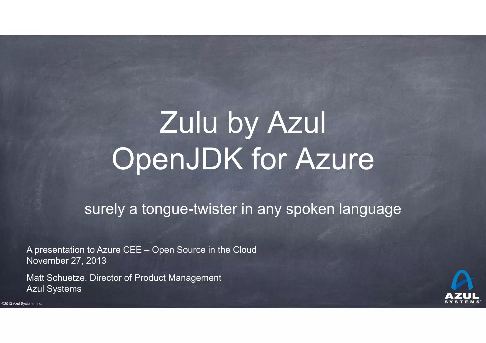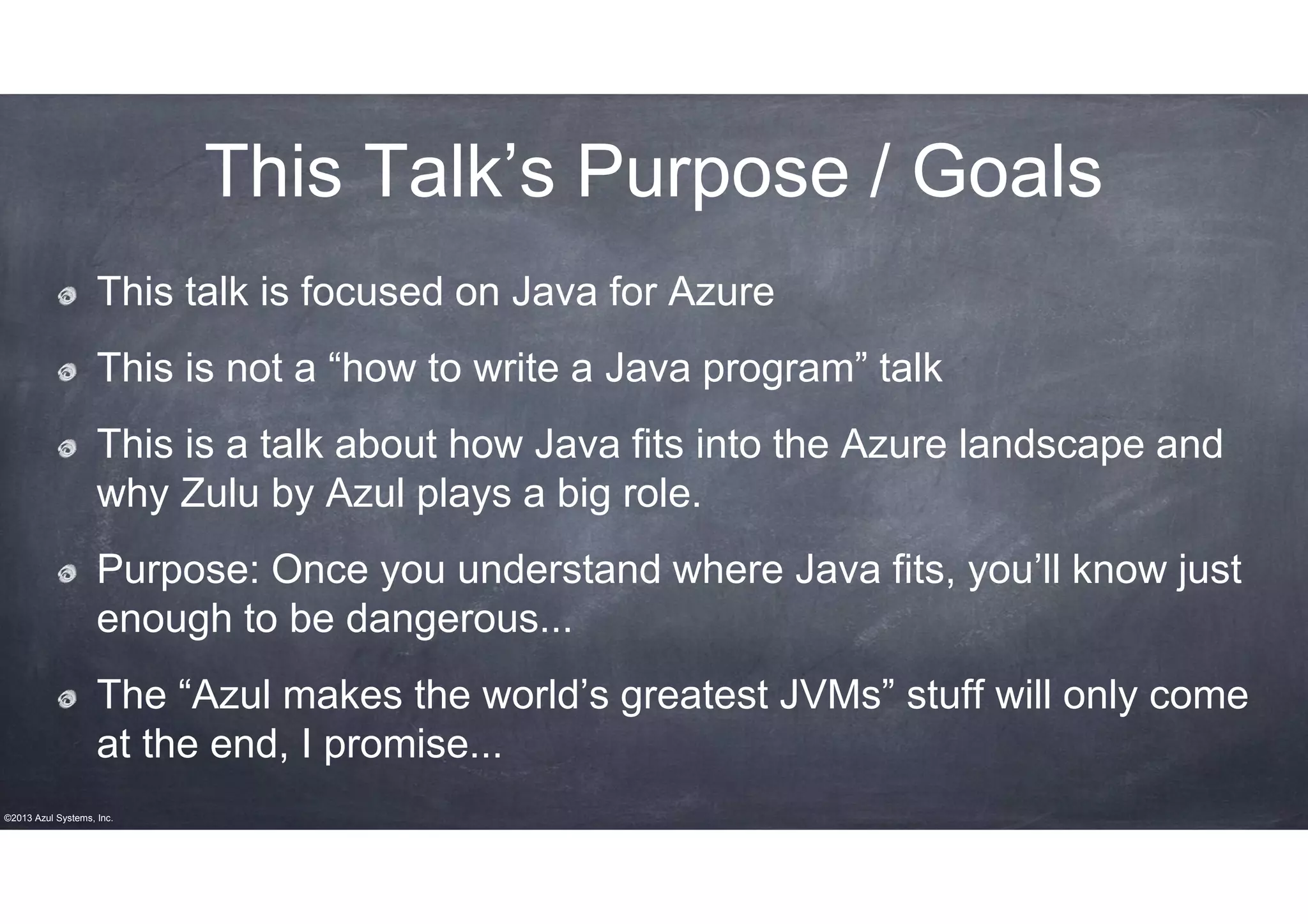 The document presents a talk about the integration of Java within the Azure cloud environment, focusing on the role of Zulu by Azul as a significant OpenJDK distribution. It outlines the evolution of Java technology, Azul's past innovations in JVMs, and the benefits of using Zulu for Java deployments on Azure. The conclusion emphasizes Zulu's reliability for Java applications in cloud environments, reinforcing Azul's position as a key provider for Java server capabilities.