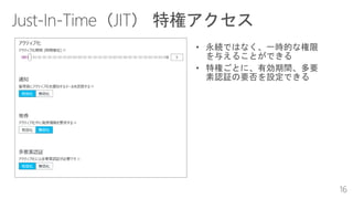 テナントに対する特権保有者の可視化と棚卸を半自動化 • セキュリティ管理者と特権保有者自身が行うためのインターフェース 特権を持つユーザーの可視化 永続化 延長 棚卸(レビュー) 有効時間 設定 削除 特権保有者を健全な状態に維持