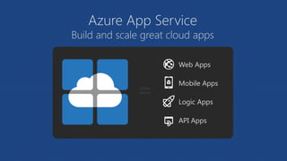 This document summarizes Azure App Service, which allows users to build and scale cloud apps. It includes Web Apps, Mobile Apps, Logic Apps, and API Apps. Key benefits include automatic OS patching, security, high availability, automated scaling, and support for many programming languages. It also describes Web Apps, WebJobs, API Apps, Logic Apps, and Mobile Apps capabilities in Azure App Service and how to get started with the platform.