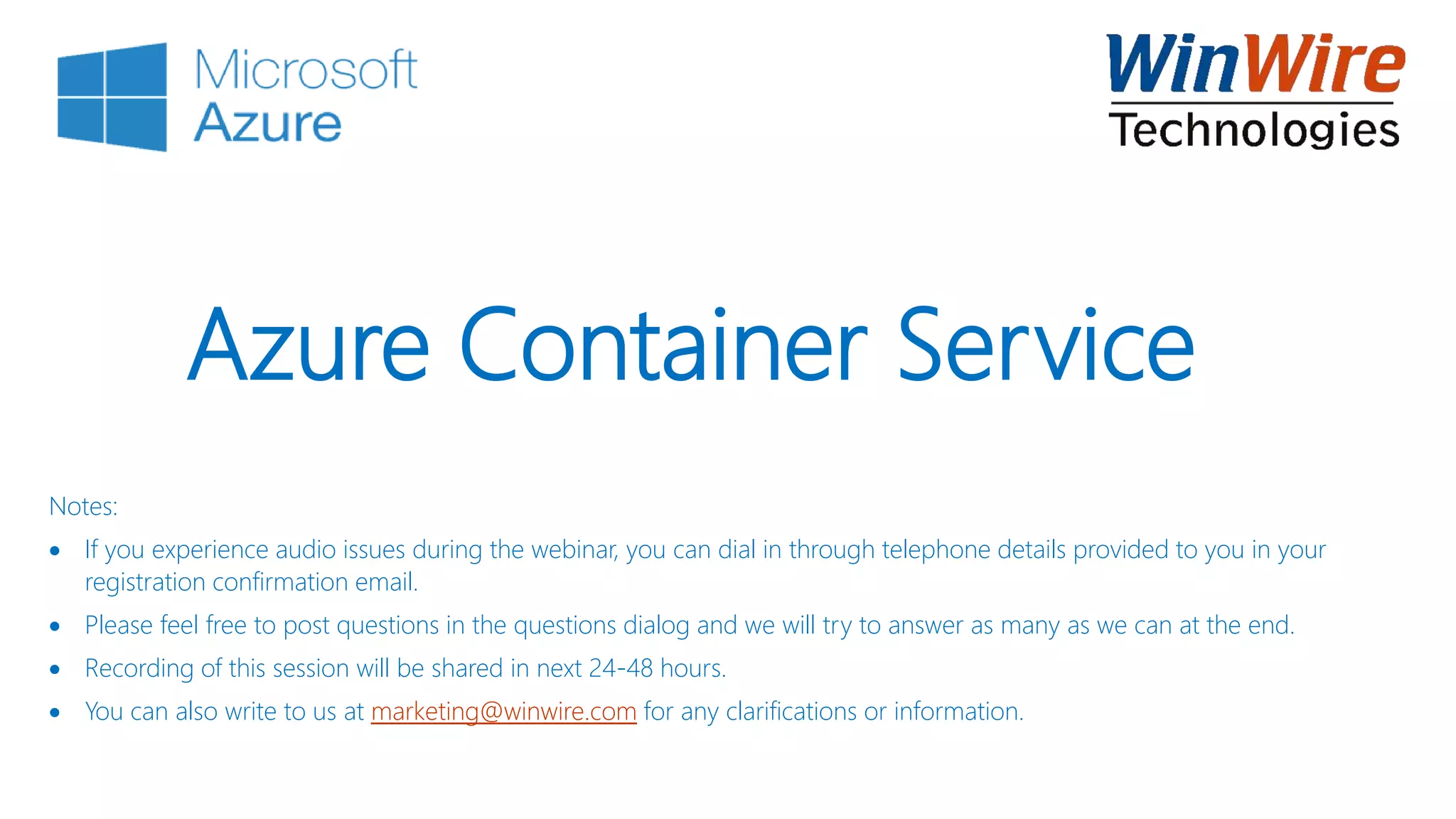The document provides information about a webinar on Azure Container Service, detailing the agenda, speaker credentials, and key topics such as container advantages, Docker engine, and orchestration methods. It highlights the benefits of containers over virtual machines, including faster deployment and resource efficiency. Additionally, it includes practical instructions for using Docker with Visual Studio and mentions the next webinar event scheduled for June 8, 2016.
