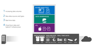 The document outlines components and processes involved in data extraction, transformation, and loading (ETL) using tools like SSIS, SQL Server, and Azure Data Factory. It discusses the creation of data pipelines, initial data sources, and processing services, as well as monitoring capabilities for managing and deploying these pipelines. Additionally, it highlights use cases such as customer profiling and analytics related to user activity and privacy considerations.