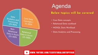 The document outlines the DP-900 Azure Data Fundamentals agenda, covering core data concepts, relational and non-relational data workloads, data analytics, and processing techniques. It details various Azure data services, including Azure SQL Database, Azure Cosmos DB, and Azure Data Factory, emphasizing their functionalities and use cases in data management and analytics. Additionally, it discusses the differences between data warehousing, ETL/ELT processes, and various NoSQL database types.