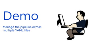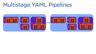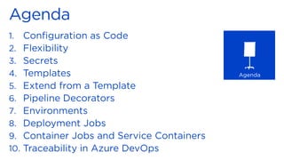 The document discusses Azure DevOps pipelines and how they can be used to implement continuous delivery of applications and infrastructure to Azure. It covers key concepts like stages, jobs, and tasks in a pipeline. It also describes how pipelines can use templates, variables, secrets, and service connections to deploy apps, infrastructure resources, databases, and run tests on Azure. Secret management using Azure KeyVault is discussed along with the use of container jobs and hosted agents.