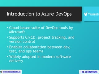Join Visualpath Azure DevOps with DevSecOps Online Training – the best choice to boost your career with expert-led instruction and real-time hands-on learning. Our Azure DevOps Training in Chennai focuses on enhancing security, mastering Azure tools, and securing CI/CD workflows. This comprehensive training, available in India, USA, UK, Canada, Dubai, and Australia, is accessible globally.Schedule your free demo today by calling +91-7032290546 Visit our Website: https://www.visualpath.in/azure-devops-online-training.html WhatsApp: https://wa.me/c/917032290546 Explore our Blog: https://visualpathblogs.com/category/azure-devops-with-devsecops/