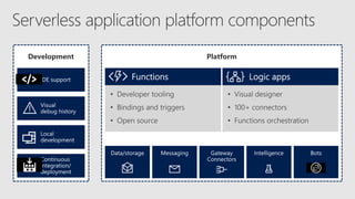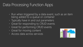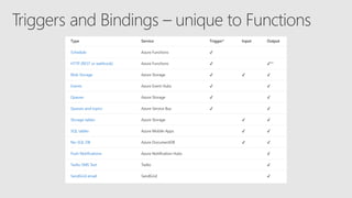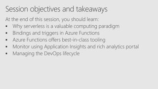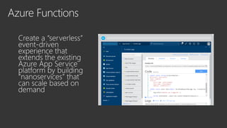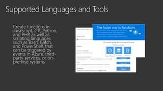 This document discusses serverless computing and Azure Functions. It asks common questions about managing servers like how often to patch and deploy code. It then introduces Azure Functions as an event-driven serverless computing platform that scales instantly based on demand and only charges for the resources used. Azure Functions allows code to run in response to events from sources like Azure Storage, Service Bus and HTTP requests. The document provides examples of common Azure Function triggers and bindings that integrate with other Azure services and external APIs. It also lists resources for learning more about Azure Functions like documentation, code samples and community support.