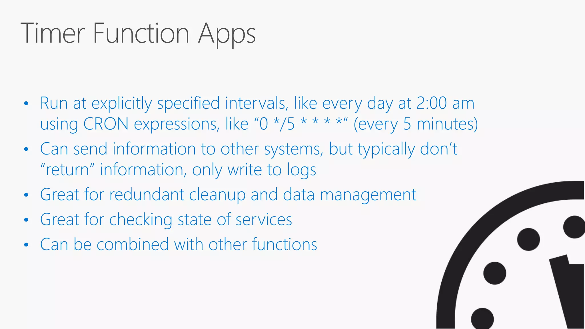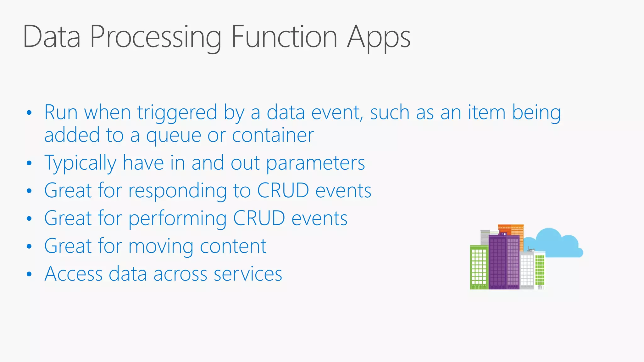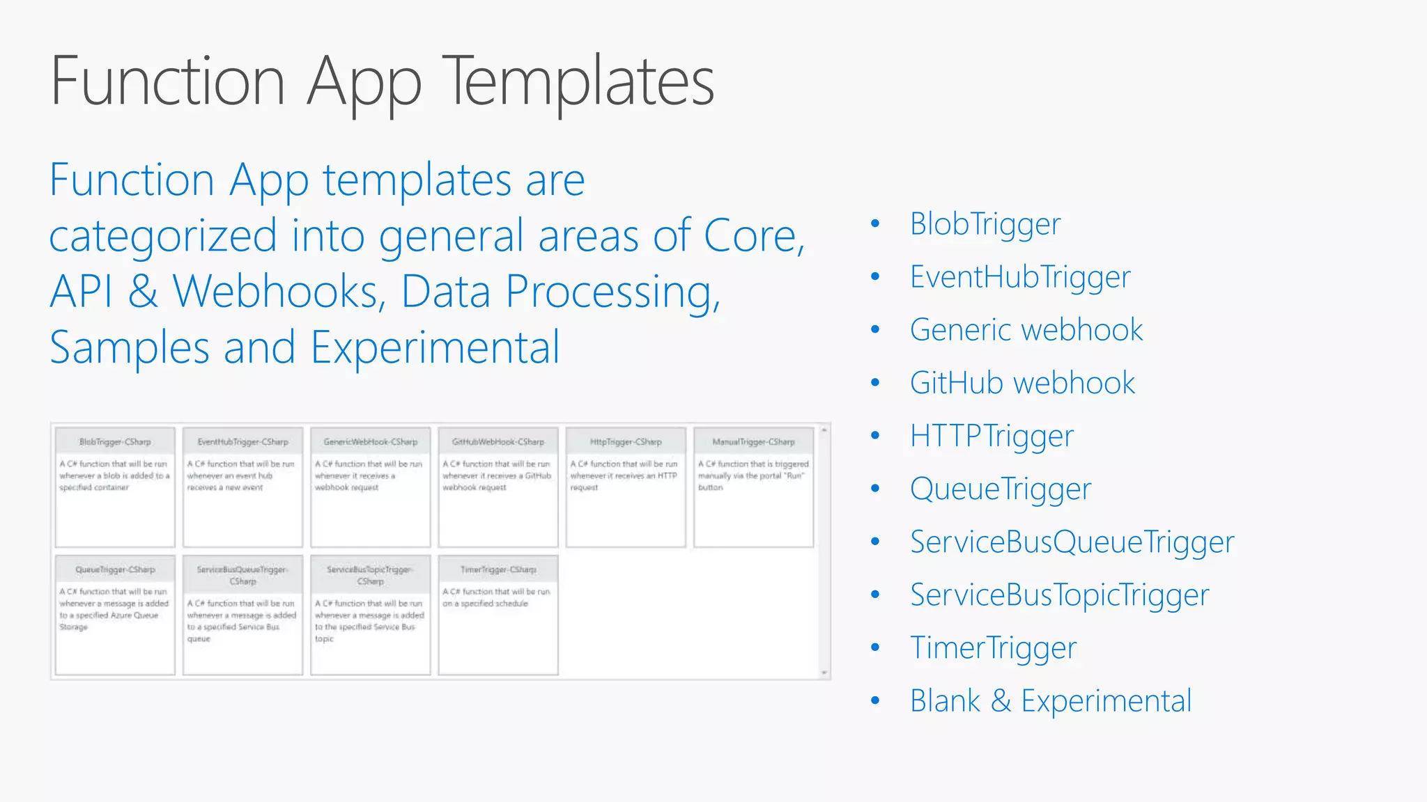 Azure Functions allow developers to write small pieces of code, or "functions", that can be run in the cloud and are triggered by events. Functions can be triggered by common data sources like Azure Blob storage, queues, and tables. Functions code can be written in C#, F#, Node.js, or Python and bindings define how functions connect to triggers and external data sources. Functions can be tested locally and deployed to Azure to be run on an event-driven schedule.