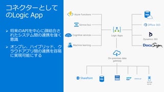 Integration – that includes core LOB apps and SaaS apps integration via Azure Logic Apps.