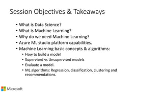 The document provides an overview of Azure Machine Learning, including its capabilities, the need for machine learning, and basic concepts of data science and algorithms. It outlines the process of developing machine learning models using known data to predict unknown outcomes, emphasizing the importance of choosing the right algorithms for different scenarios. Azure Machine Learning aims to simplify the process of creating and deploying machine learning solutions, making them accessible to various users and applications.