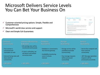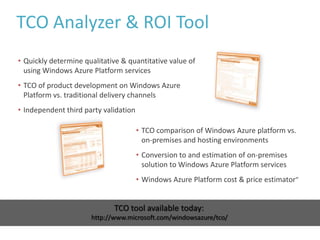 This document contains the slides and script for a presentation on Windows Azure by John Weston from Microsoft. The presentation introduces cloud computing and defines it as running applications using shared computing resources that can scale on demand. It outlines the components of the Windows Azure platform including compute, storage, databases and services. It discusses how to get started with Windows Azure and pricing models. It also previews upcoming features like pre-configured virtual machines and enhanced storage capabilities. The goal is to answer questions about cloud computing, Microsoft's commitment to it, what Windows Azure is, cost savings potential, and its future direction.