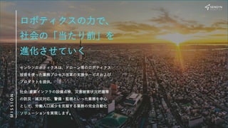ロボティクスの⼒で、 社会の「当たり前」を 進化させていく M I S S I O N 社会/産業インフラの設備点検、災害被害状況把握等 の防災・減災対応、警備・監視といった業務を中⼼ として、労働⼈⼝減少を克服する業務の完全⾃動化 ソリューションを実現します。 センシンロボティクスは、ドローン等のロボティクス 技術を使った業務プロセス改⾰の⽀援サービスおよび プロダクトを提供。