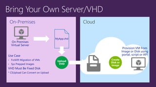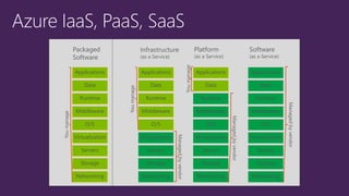 The document discusses various application scenarios for Windows Server, Hyper-V, and Azure, focusing on migration strategies from physical servers to virtual machines and cloud environments. It highlights the capabilities of Azure for development, testing, and running applications, alongside features such as virtual networking and automation with PowerShell. Additionally, it covers SQL Server implementations both in Azure VM and as a managed service, emphasizing performance, availability, and backup strategies.