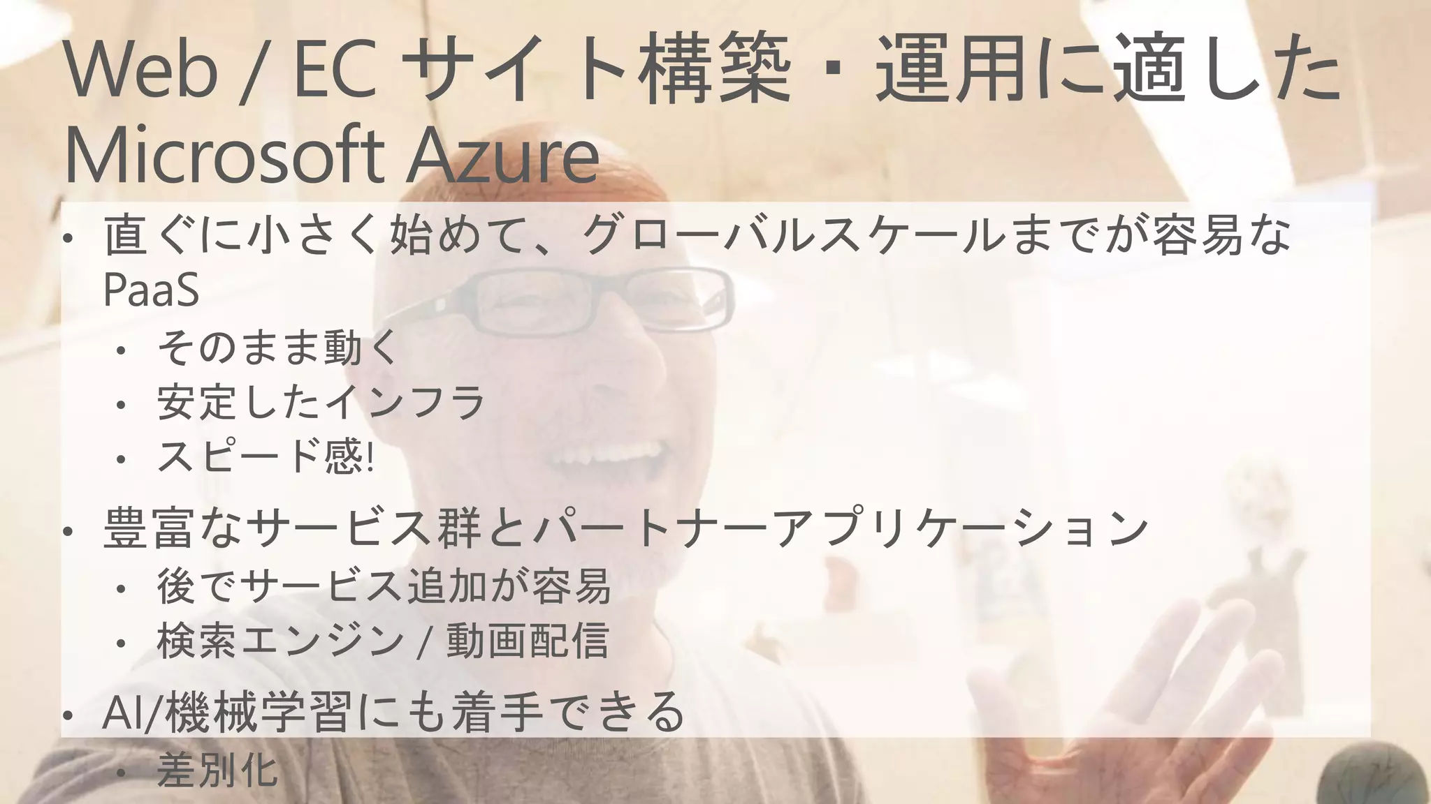 デジタルのパワーをビジネスに取り入れる動きは加速度的に増えています。クラウドのプラットフォームの選択肢もその一つですが、一体どのようなサービスがあって、何に適しているのでしょうか? このセッションでは、主にWeb/ECサイトやデジタルマーケティングに役に立つAzureの各種サービスをご紹介いていきます。Azure Web App、SQL DatabaseといったWeb-DBのべースや、AIの基盤といえるAzure Machine Learning、そして、それらの可視化のためのPower BIなどを取り上げます。