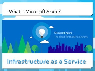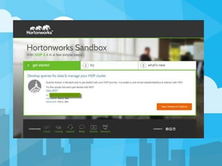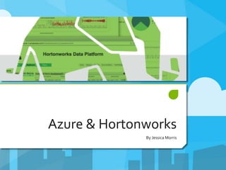 The document discusses installing Hortonworks on Microsoft Azure by describing what Azure and Hortonworks are, the steps to setup an Azure virtual machine including selecting a server location and machine type, and finalizing the setup by accessing Ambari through the public IP address. It provides resources for learning more about deploying Hortonworks on Azure and introductions to Hadoop, Hive, and Pig.