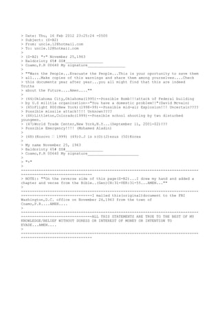 The document contains a series of warnings and predictions about future events including: the 1995 Oklahoma City bombing, the 1998 crash of TWA Flight 800, the 1999 Columbine school shooting, and the 2001 attacks on the World Trade Center. It claims the author mailed the original document to the FBI office in Washington D.C. in 1963, predicting these events decades prior. The document encourages recipients to make copies and check the warnings against future events to verify their accuracy.