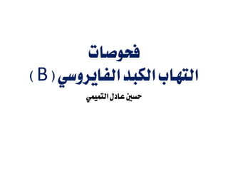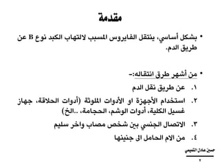 يتناول المستند فيروس التهاب الكبد B، موضحاً آليات انتقاله، أعراض المرض وأشكاله، بالإضافة إلى صعوبات التشخيص، والفيروسات المتضمنة في التركيب، والاستجابة المناعية. كما يناقش الفحص المخبرى اللازم لتأكيد الإصابة ونتائجها المحتملة، والمتعلقة بتطبيعات مختلفة للحالة المرضية. يركز أيضًا على أهمية اللقاح في توفير مناعة دائمة ضد الفيروس.