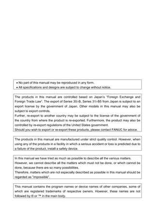 This manual provides instructions for connecting machine tools to FANUC Series 30i-B, 31i-B5, 31i-B and 32i-B CNC systems. It describes the total connection diagrams, installation requirements, power supply connections, connections to peripheral devices and servo/spindle interfaces. The manual also covers connections to FANUC I/O Link I/O units and the handling of stop and emergency stop signals.