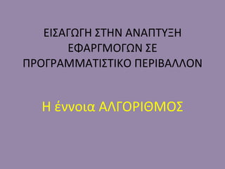 Η έννοια ΑλγόριθμοςΣυναντήσαμε τον όρο «αλγόριθμος» ως ένα κοινό παρονομαστή των γλωσσών προγραμματισμού. Επίσης, τον συνδέσαμε με την έννοια του προβλήματος. Ο «αλγόριθμος» χρησιμοποιείται για να δηλώσει μεθόδους που εφαρμόζονται για την επίλυση προβλημάτων. Πώς ορίζεται όμως ως έννοια;