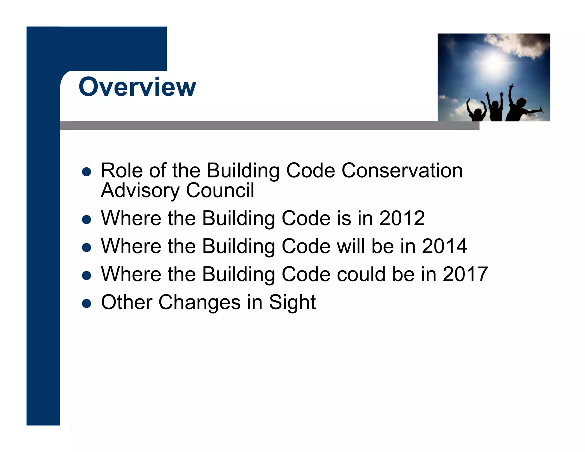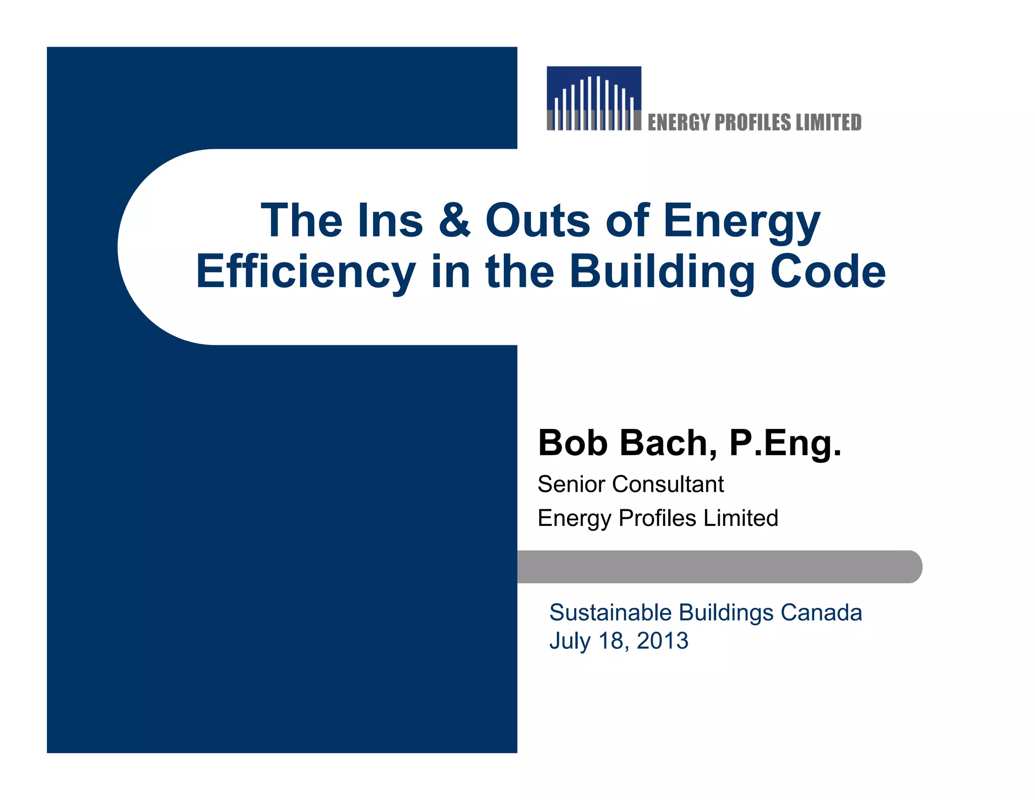 The document discusses the evolution and regulations of energy efficiency within building codes in Canada, specifically focusing on the roles of the Building Code Conservation Advisory Council and various compliance standards. Key changes include performance ratings for residential buildings and updates to energy efficiency requirements projected for 2014 and beyond. It also outlines compliance paths and the implications of emissions limitations under the 2017 supplementary standard SB-10.
