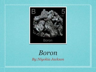 This document provides information about the chemical element boron. It states that boron has an atomic number of 5, atomic mass of 10.811, melting point of 2,076 degrees Celsius, and boiling point of 3,927 degrees Celsius. Boron is a semi-metal with a rhombic crystal structure and density of 2.460 g/cc. It was discovered in 1808 by Sir Humphry Davy and J.L. Gay-Lussac and is used to produce green colors in pyrotechnics, as an ignition source in rockets, and in controlling nuclear reactors.