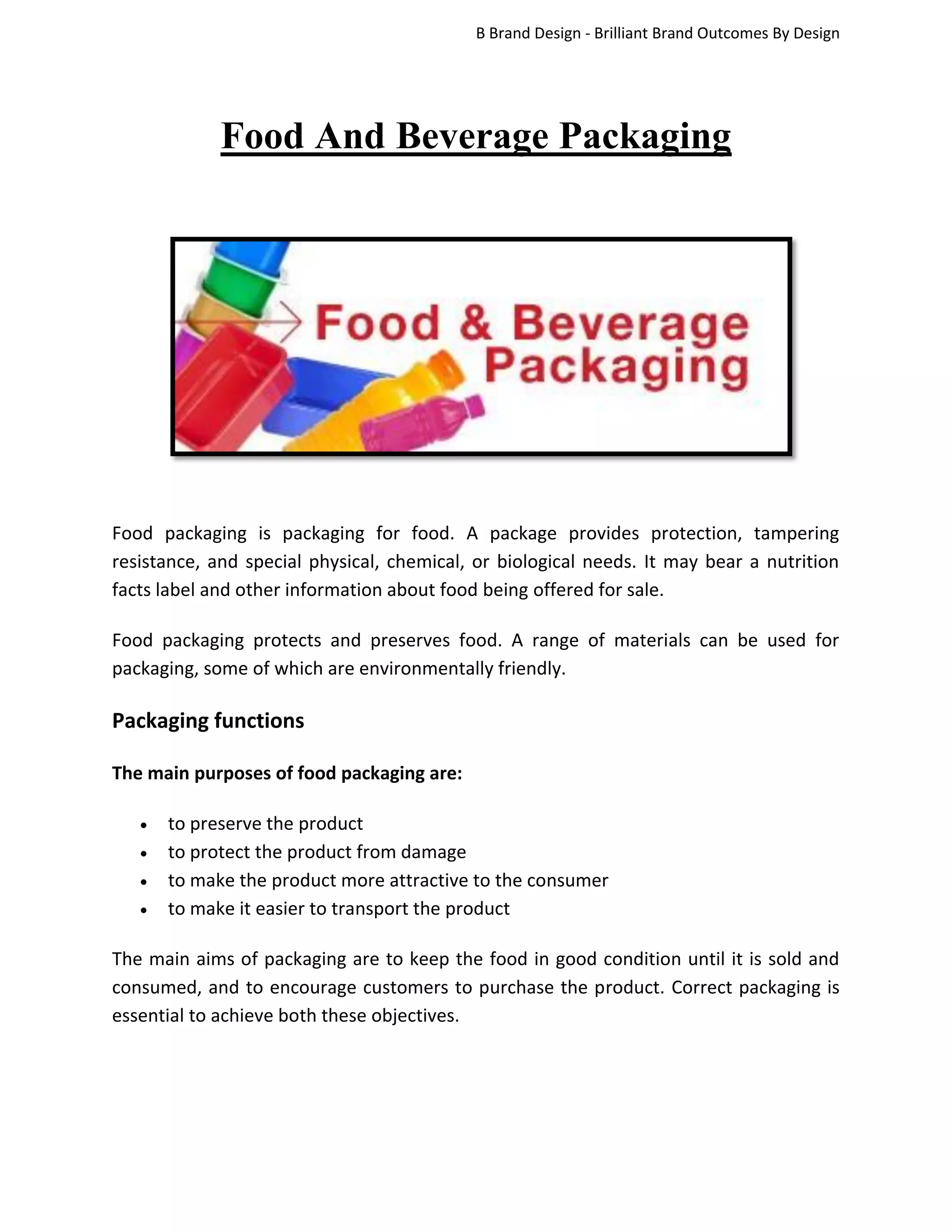 The document outlines the significance of food and beverage packaging, emphasizing its role in preserving and protecting products, enhancing consumer appeal, and facilitating transport. It discusses various packaging materials and their functions, while highlighting the necessity of proper packaging to reduce waste and improve distribution. Additionally, it presents the services offered by b brand design, which focuses on innovative and strategic packaging solutions for the food industry, particularly in beverage packaging.