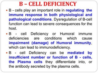 B-cell deficiency is a condition where the body has impaired humoral immunity due to a lack of proper B-cell function. B-cells play an important role in regulating the immune response, and dysregulation can lead to health issues. B-cell deficiency can be caused by not enough or non-functioning B-cells, plasma cells they differentiate into, or antibodies secreted by plasma cells. Symptoms include sinus infections, sepsis, skin infections, and pneumonia due to bacteria, fungi, viruses, and protozoa. Diagnosis involves measuring immunoglobulin levels and B-cell counts. Treatment focuses on managing infections, surveillance of potential malignancies, and immunoglobulin replacement therapy.