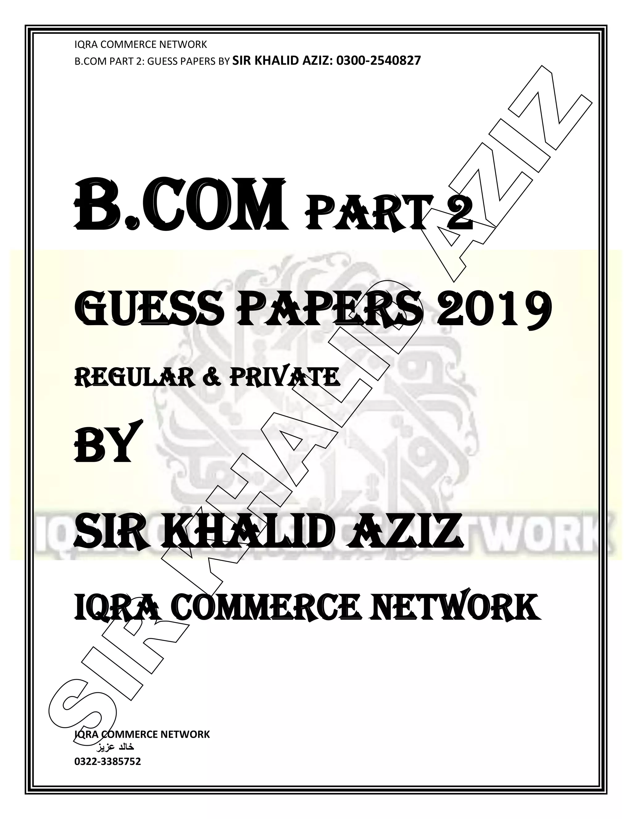 This document provides information about B.Com Part 2 guess papers and important questions for various subjects by Sir Khalid Aziz. It includes guess papers and important questions for subjects like Banking and Finance, Auditing and Income Tax, Management, Advanced and Cost Accounting, Cost Accounting, Business Communication, and Economics of Pakistan. It also provides contact information for Sir Khalid Aziz including his phone numbers to get access to these guess papers and important questions.