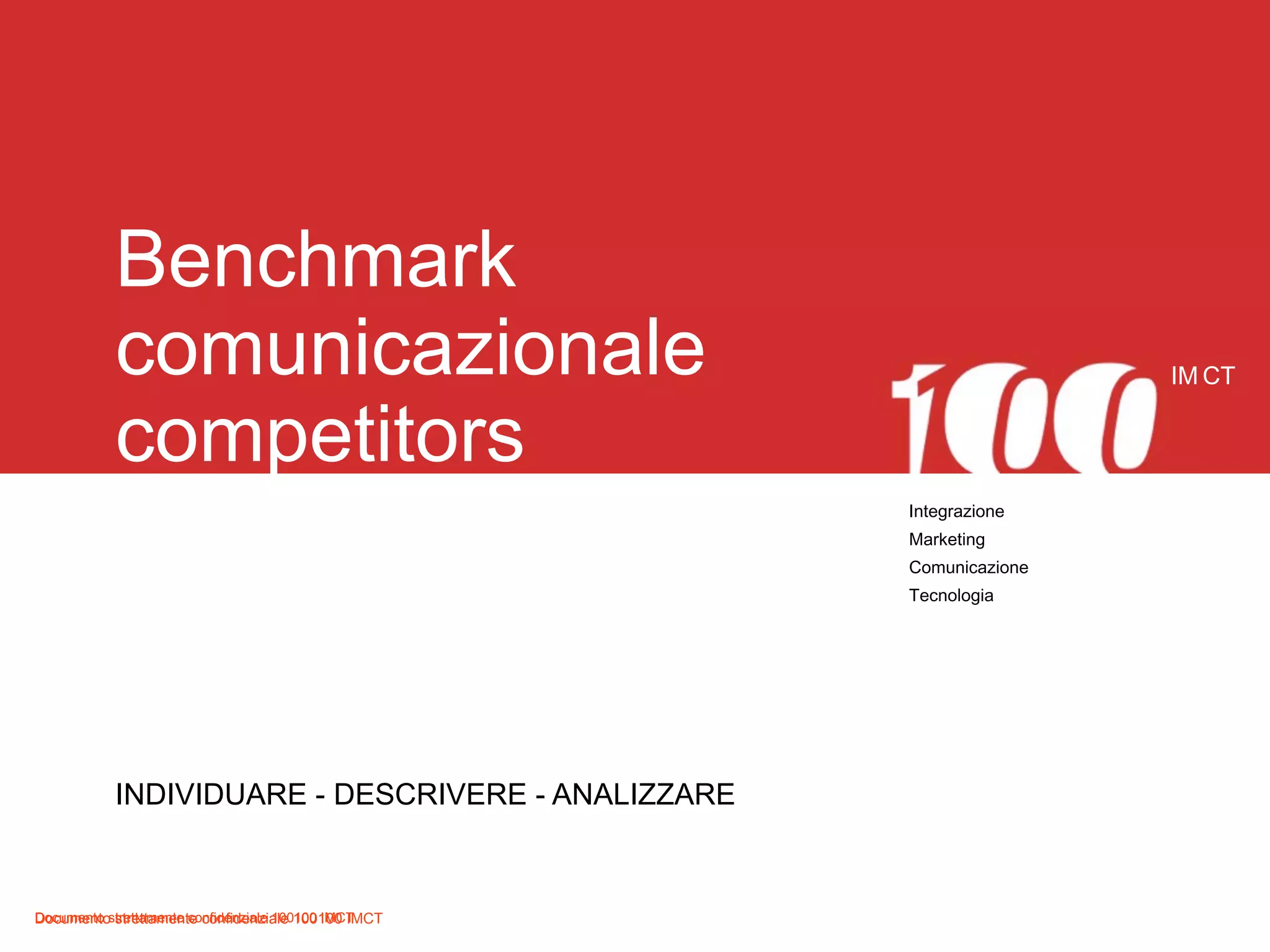 Il documento analizza in profondità le strategie di marketing e comunicazione di un'azienda, enfatizzando l'importanza di un benchmark per valutare la propria posizione rispetto ai concorrenti. Viene descritto un metodo per identificare e analizzare gli oggetti di comunicazione e le strutture comunicative, includendo vari aspetti del branding e della comunicazione, sia online che offline. Infine, si sottolinea il ruolo dei valori aziendali e della sociabilità nella costruzione dell'immagine di marca.