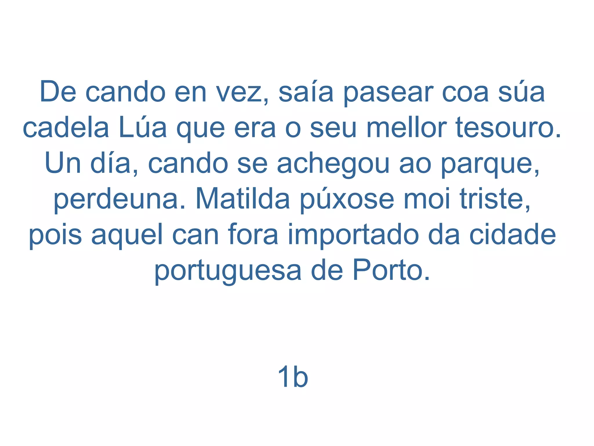 De cando envez, saía pasear coa súa cadela Lúa que era o seu mellor tesouro. Un día, cando se achegou ao parque, perdeuna. Matilda púxose moi triste, pois aquel can fora importado da cidade portuguesa de Porto. 1b