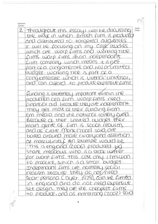 This document provides an analysis and commentary on two responses to exam questions about media representation and film production/distribution. For question one, about representation in a film clip, the response discusses mise-en-scène, editing, and sound to analyze how age and innocence are represented. For question two, about funding and distribution for independent and Hollywood films, the response compares Warp Films and Working Title, discussing funding models, technology impacts, and distribution strategies. The commentary evaluates both responses as strong, with good use of examples and terminology to back up explanations and arguments.