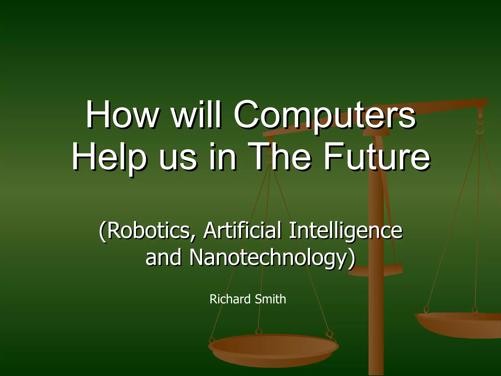 The document discusses how computers will help humans in the future through robotics, artificial intelligence, and nanotechnology. Robots will be able to perform dangerous tasks and help the elderly through beds that convert to wheelchairs. Nanotechnology will provide jobs and be less expensive, allowing more widespread use.