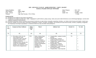 Dokumen ini adalah kisi-kisi soal untuk ulangan akhir semester I mata pelajaran Bahasa Inggris kelas VIII di SMP Wonogiri dengan total 50 soal. Kisi-kisi ini mencakup kompetensi inti dan dasar yang berkaitan dengan kemampuan berbahasa Inggris, termasuk memahami ungkapan sosial, menyusun teks, dan mengidentifikasi struktur kebahasaan. Penyusun dokumen ini adalah Agus Rudi Purwanto, S.Pd., M.Hum.