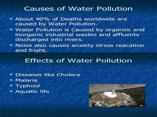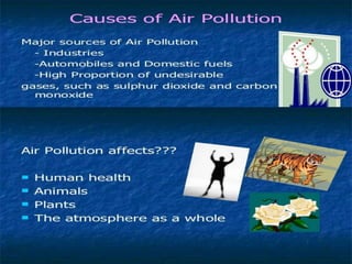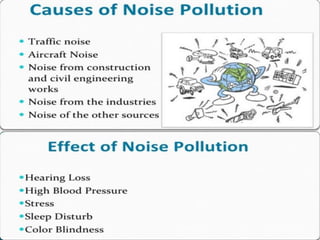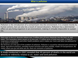Pollution is the introduction of contaminants into the environment through human or natural actions. It has detrimental effects on living organisms, making environments unable to sustain life. Different types of pollution include air, water, noise, and land pollution. Air pollution occurs when harmful gases, dust, fumes or odors are introduced into the air. Water pollution changes the quality of water in a way that harms living things. Noise pollution includes any loud, undesirable noise. Land pollution degrades the earth's surfaces through misuse of resources. Environmental issues today include global warming, pollution, loss of natural resources, and nuclear problems. Global warming increases temperatures due to greenhouse gases. Pollution is a daily problem. Loss of resources threatens ecosystems as