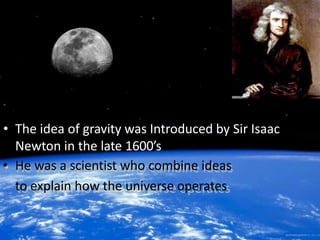 Newton discovered gravity through observing an apple fall from a tree, realizing that the same force pulling the apple downward also attracts the earth. He then formulated the law of universal gravitation, which states that every object in the universe attracts every other object with a force directly proportional to the product of their masses and inversely proportional to the square of the distance between them. This explains that all objects experience gravitational attraction depending on their mass and proximity to each other.