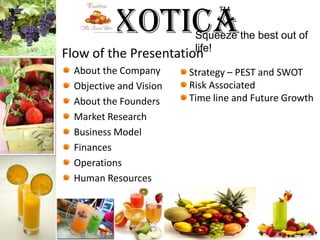 Exotica aims to launch a chain of juice bars and offer home delivery of freshly squeezed juices in India. It will differentiate itself by providing natural juices without excessive sugar or additives. The founders have relevant business qualifications and plan to target health-conscious customers. Exotica will source, process and deliver juices hygienically based on research on small-scale juice processing. It will recruit staff and develop a menu of standard, exotic and health-focused juices to attract different customer segments.