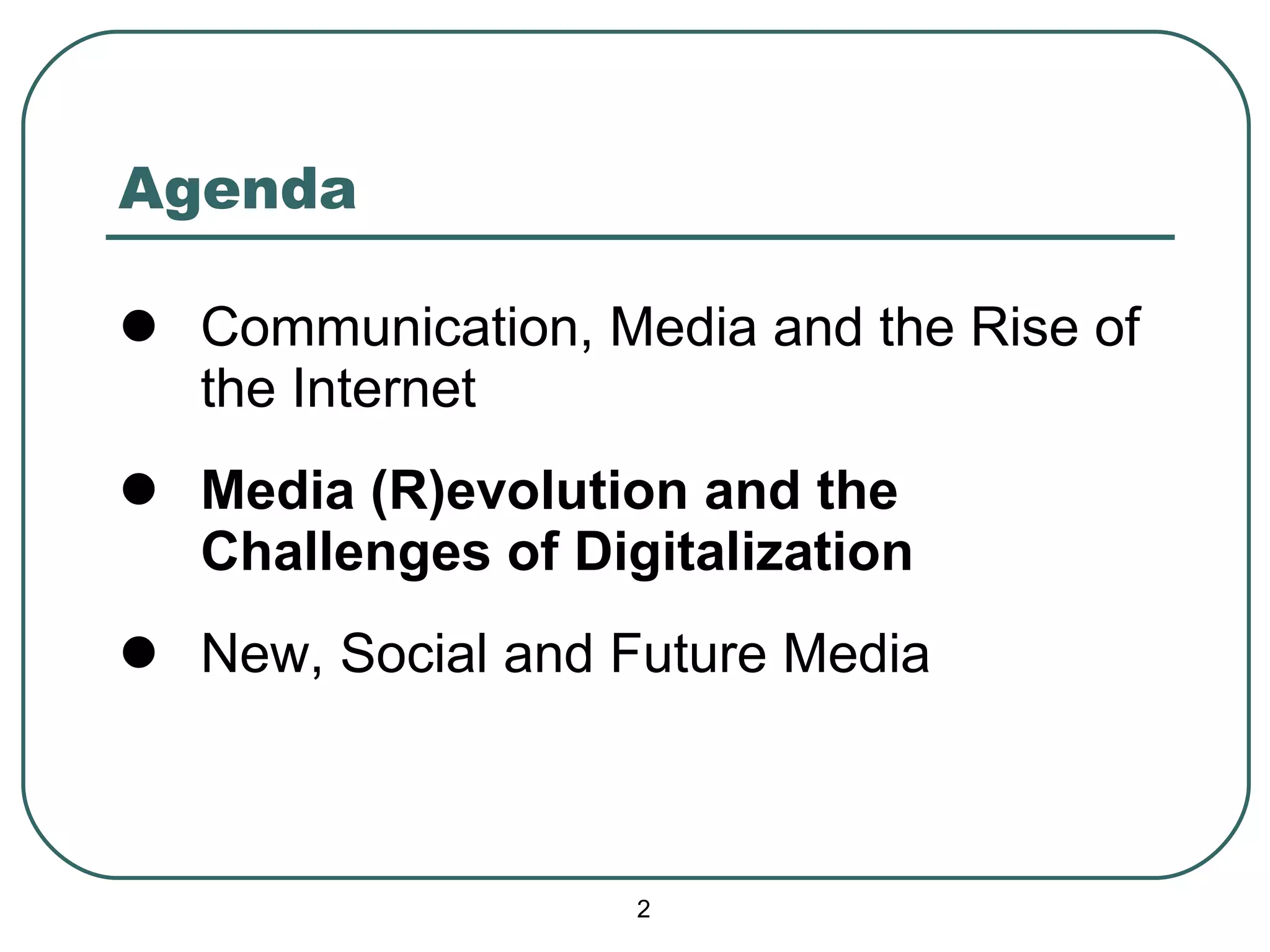 The document discusses the evolution and revolution of media brought about by the rise of the Internet and digital technologies. It analyzes how the Internet has fragmented audiences and led to the multiplication of media channels. While the Internet has impacted television viewing habits, it may not completely replace television due to television's social and lean-back experiences. The future of media will likely see all content converge on the Internet as more content becomes personalized and accessible across different devices and platforms.