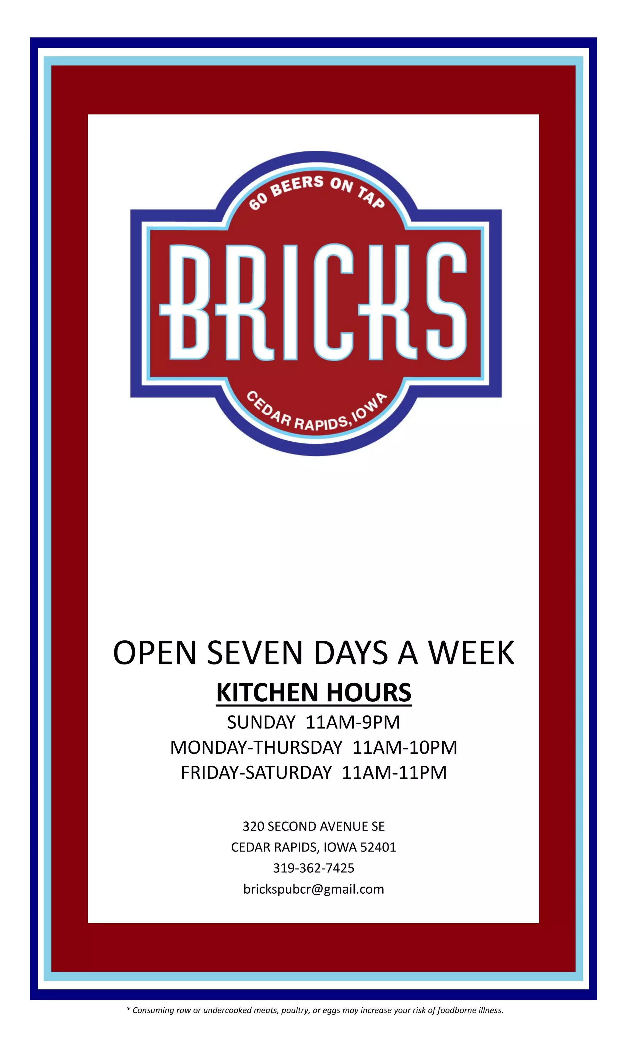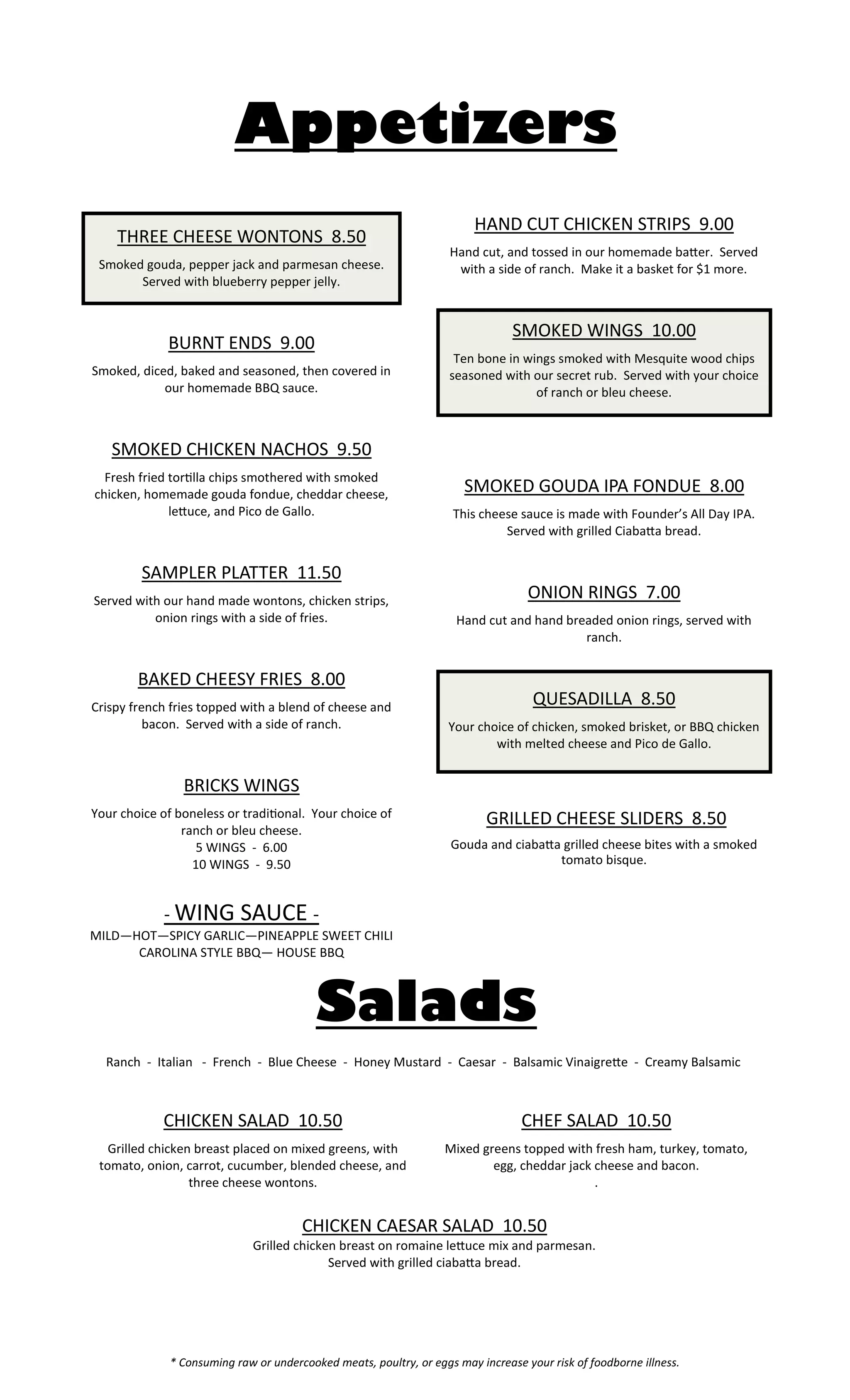 This document is a menu for Brick's Pub in Cedar Rapids, Iowa. It lists appetizers, salads, smoked meats, burgers, wraps, sandwiches and sides available. A warning is given at the top that consuming undercooked meats may increase risk of foodborne illness. The menu offers a variety of appetizers, sandwiches and entrees made with smoked meats like brisket, pulled pork and chicken. Sides include fries, cole slaw, baked beans and onion rings.
