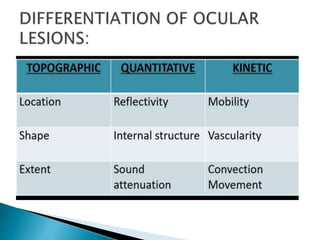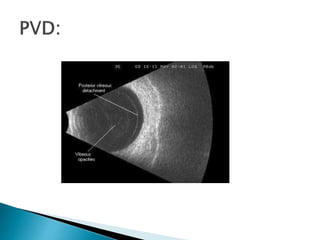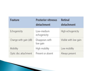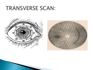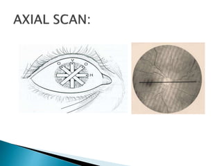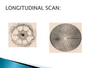 The document discusses B-scan ultrasound, providing a history of its development and describing the technical aspects and clinical applications. It notes that B-scan utilizes high frequency sound waves to produce two-dimensional images, and was first introduced in 1958. The document outlines the physics behind B-scan, describing how sound waves are reflected and the factors that determine resolution. Clinical uses mentioned include evaluating vitreous opacities, retinal detachments, and tumors.