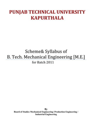 This document outlines the scheme and syllabus for the Bachelor of Technology in Mechanical Engineering program at Punjab Technical University for the 2011 batch. It provides details of the courses offered in the third semester, including course codes, titles, credits, and brief descriptions. Some of the key courses covered in the third semester include Strength of Materials, Theory of Machines, Machine Drawing, Applied Thermodynamics, and Manufacturing Processes. The document also lists the assessment structure, distribution of marks, and contact hours for each course.